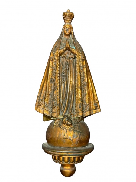 • ARTE SACRA, uma (1) imaginária de parede confeccionada em estuque representando Nossa Senhora de Aparecida revestida em folha de cobre, apresenta colado e lascado na parte inferior, medindo 39x16cm.