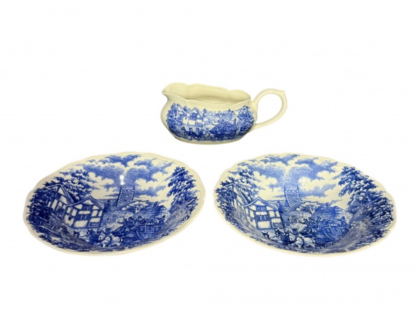 • FAIANÇA OXFORD VITRAMIK, lote com três (3) peças, sendo: A) 1 molheira, medindo 9x21x8cm e B) 2 saladeiras, medindo 5x25cm, confeccionados em faiança nacional na tonalidade branca com pintura de carruagem inglesa na tonalidade azul.
