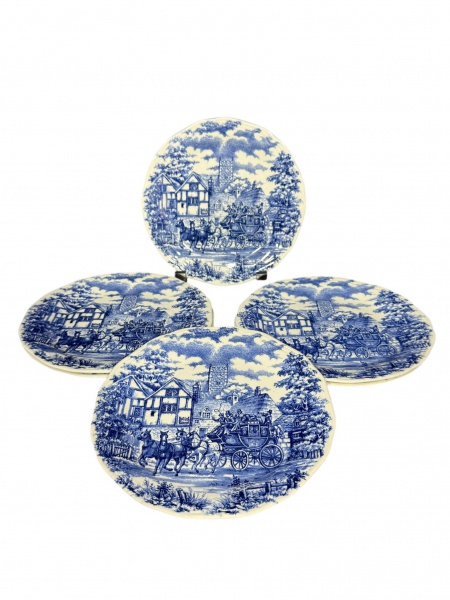 • FAIANÇA OXFORD VITRAMIK, seis (6) pratos rasos confeccionados em faiança nacional na tonalidade branca com pintura de carruagem inglesa na tonalidade azul, medindo 23cm.