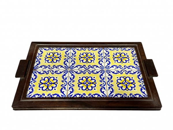 • DIVERSOS, uma (1) bandeja retangular confeccionada em jacarandá com incrustação de azulejos com pinturas florais nas tonalidades azul e amarela, 1 rachado e outros com fios de cabelo, medindo 42x28cm.