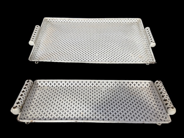 • DIVERSOS, duas (2) bandejas dos anos 50 confeccionadas em metal patinado na tonalidade branca decorada por flores em vazados, apresentando falhas na patina e sinais de oxidação, maior medindo 47x28cm e menor 37x15cm.