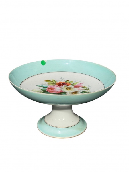 • PORCELANA, uma (1) fruteira de pé confeccionado em porcelana na tonalidade branca, decorada por flores e folhagens em policromia e espessa faixa na tonalidade azul com filetes em ouro, apresentando leves falhas na douração e bicado na borda, medindo 12x21,5cm.