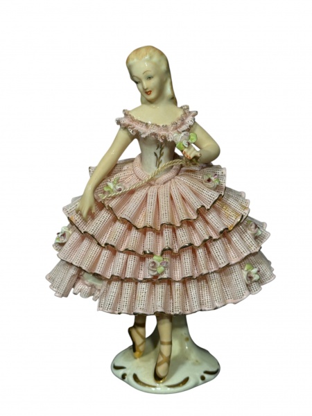• ESCULTURA, uma (1) escultura confeccionada em porcelana da manufatura REBIS representando dama antiga com trabalho em rendilhados na tonalidade rosa, flores e folhagens em policromia e relevo, apresentando quebra na renda, medindo 15,5cm de altura.
