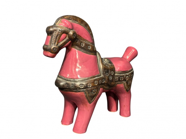 • ESCULTURA, uma (1) escultura confeccionada em faiança na tonalidade roxa representando cavalo com arremates na tonalidade marrom, medindo 25,5x26x10cm.