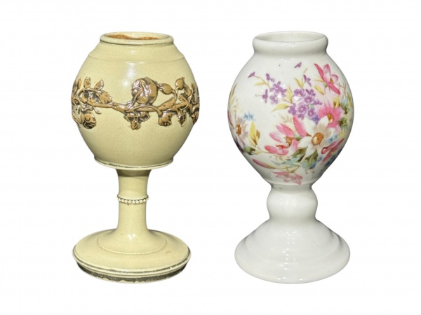 • PORCELANA e FAIANÇA, duas (2) cuias para chimarrão, sendo: A) 1 confeccionada em porcelana na tonalidade branca, corpo bojudo, haste gomada e base circular escalonada, decorado por flores e folhagens em policromia e borda com fio de cabelo, medindo 14cm de altura e B) 1 em faiança esmaltada na tonalidade cinza, decorada por guirlanda floral em monocromia com realces em prata, medindo 14cm.