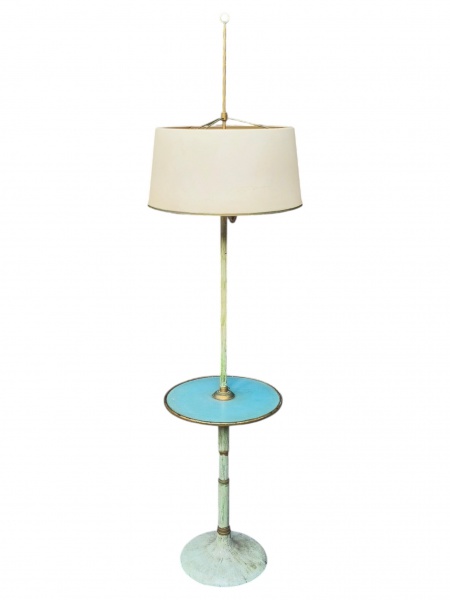 • LUMINÁRIA, uma (1) luminária de piso estilo inglês para duas lâmpadas com estrutura metálica com patina esverdeada, haste central cilíndrica, estágio superior, apoiado sobre base circular, cúpula regulável, dois braços curvos, em bom estado de conservação, medindo 175cm de altura.