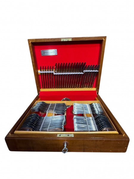 • FAQUEIRO, faqueiro com cento e uma (101) peças confeccionadas em aço inox da manufatura HERCULES, sendo: A) 12 facas para jantar serrilhadas, B) 12 garfos para jantar, C) 12 facas para sobremesa serrilhadas, D) 12 garfos para sobremesa, E) 12 colheres de sopa, F) 12 colheres de sobremesa, G) 12 colheres para chá, H) 12 colheres para café, I) 5 peças para servir: 1 colher de arroz, 1 concha, 1 açucareiro, 1 garfo e 1 colher para salada, acondicionados em caixa original em madeira com leves ranhuras e acompanha chave.