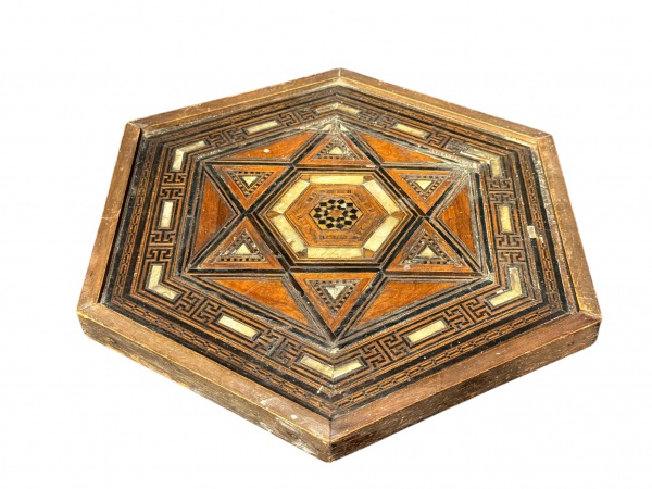 • DIVERSOS, uma (1) bandeja sextavada confeccionada em madeira com rica decoração geométrica em marchetaria de tonalidades distintas e madre pérola, apresenta falhas na madeira e na marchetaria, medindo 26x30cm.