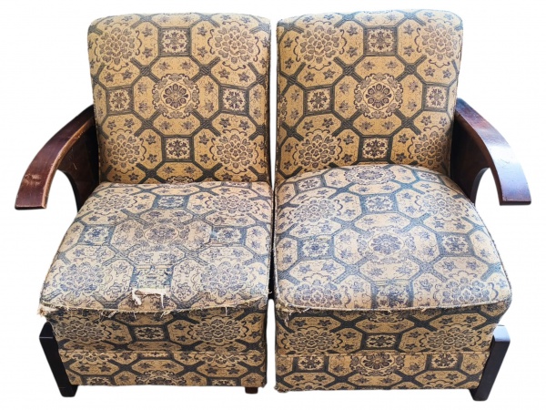 • MOBILIARIO, um (1) sofá para dois lugares com estrutura confeccionada em madeira, braços curvos aparentes e assentos e encostos estofados, revestidos em tecido estampado de padronagem geométrica e floral, apresenta desgastes no tecido e ranhuras na madeira, medindo 83x120x80cm.1 pé solto.