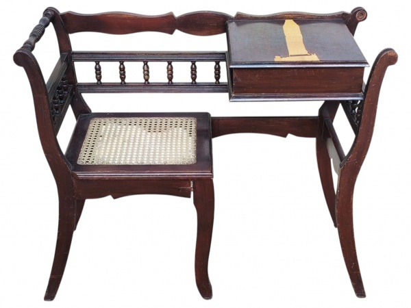 • MOBILIARIO, uma (1) escrivaninha de senhora/cadeira-escrivaninha, confeccionada em madeira escura, com assento em palhinha sintética, espaldar recortado com elementos torneados e tampo lateral para escrita com ausência da gaveta, apresenta falhas no tampo, faltando torneado da lateral, vide foto, medindo 75,5x90x37cm.