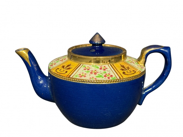 • FAIANÇA INGLESA, um (1) bule para chá confeccionado em faiança vitrificada na tonalidade azul cobalto, espessa faixa listrada nas tonalidades branca e mostarda decorada por elementos florais em policromia com arremates em ouro, apresentando falhas na douração, medindo 12x22x8cm.