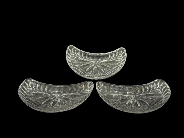 • CRISTAIS, três (3) espinheiras confeccionadas em cristal translucido, formato meia lua, lapidado por palmas, sulcos e bordas geométricas em baixo relevo, medindo 21,5x13,5cm.