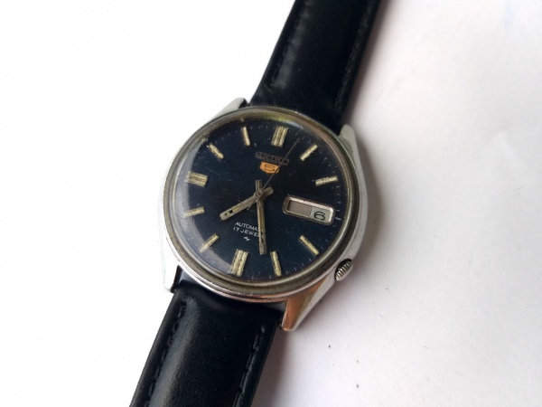 • Vintage Coleção, Bonito Relógio Seiko 5 Azul Marinho, Automático, 1970/ 80`s, em aço medindo 37mm de diâmetro. Segundeiro Central. Cifras em relevo com tinta luminosa um pouco envelhecida, Calendário duplo. Coroa 4hs. Fundo em aço de rosca, série 7006. Máquina original 21J 7006 funcionando, sem revisão recente. Pulseira Nova