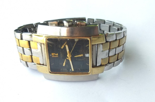 • Fashion Luxo Coleção, Restauração, Relógio Tissot Cronógrafo Retrô, Curvex, 6 Ponteiros. Quartz. Vidro cristal. Medindo 35mm. Preto com ponteiros dourados. Calendário em dígito e ponteiro na posição 6hs. Fundo parafusado. Máquina Original swiss parada. Para revisar ou retirar peças. Pulseira original com regulagem para pulsos de 17cm