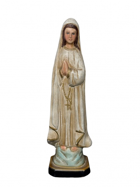 • ARTE SACRA, uma (1) imaginária confeccionada em madeira entalhada a mão representando Nossa Senhora de Fátima com patina policromada e realces em douração, medindo 34,5cm de altura.