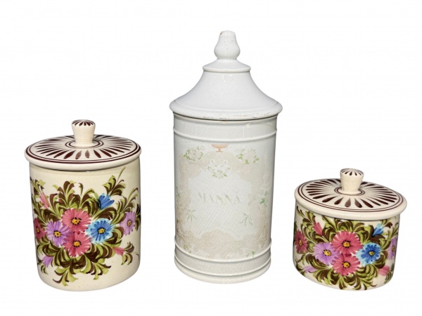 • FAIANÇAS, lote com três (3) peças, sendo: A) 1 pote de farmácia confeccionado em faiança vitrificada na tonalidade branca, vestígios de inscrição MANNÁ (refere-se geralmente ao Maná Infantil (óleo de rícino 100% puro), um laxante de ação rápida para constipação ocasional e uso tópico como emoliente) e elementos florais, apresenta sinais de craquele, medindo 25x10,5cm, leves bicados na borda e B) 2 porta condimentos confeccionados em faiança na tonalidade creme, possivelmente WEISS, com decoração floral em policromia e filetes na tonalidade marrom, 1 possui bicado na tampa, medindo 16x10cm e menor 11x10cm.