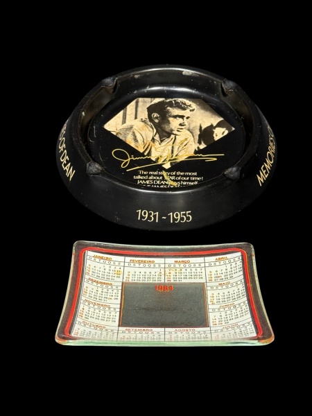 • DIVERSOS, lote com dois (2) cinzeiros, sendo: A) 1 confeccionado em metal esmaltado na tonalidade preta decorado com imagem de James Dean, inscrição Memories of Dean, e datas 19311955, medindo 17cm e B) 1 cinzeiro em vidro translucido com decoração representando calendário de mesa em vidro, referente ao ano de 1964, com bordas arredondadas, medindo 12x12cm.