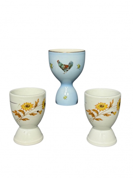 • PORCELANAS, lote com três (3) porta ovos confeccionados em porcelana branca, sendo: A) VISTA ALEGRE, 1 com pintura azul decorado por galinhas e pintinhos e policromia e borda filetada em ouro, medindo 10x7cm e B) REAL, par decorado por flores e folhagens em policromia e filete em ouro, medindo 9x6cm.