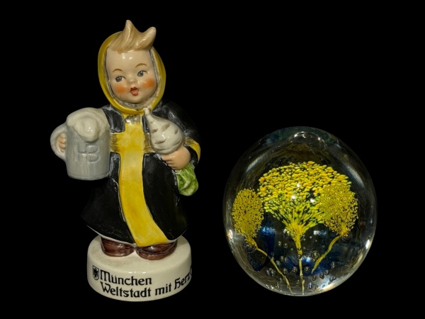 • ESCULTUR e MURANO, lote com duas (2) peças, sendo: A) W. GOEBEL GERMANY, uma (1) escultura confeccionada em faiança alemã na tonalidade branca representando figura trajando roupas tradicionais com um caneco de cerveja e um rabanete, com a inscrição "München Weltstadt mit Herz" na base, medindo 13cm e B) 1 peso de papel confeccionado em vidro de Murano translucido decorado por elementos florais internos e bulicantes, medindo 8cm de altura.