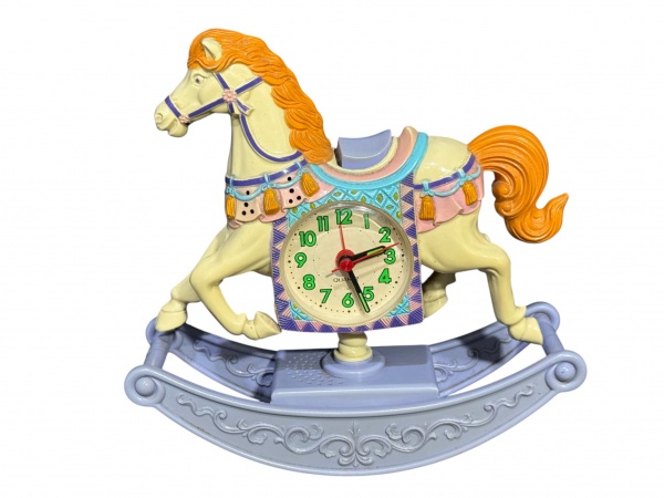• RELÓGIO, um (1) relógio de mesa vintage confeccionado em material plástico representando cavalinho de balanço esmaltado em policromia, maquina quartz, a pilha, não testado e sem garantia de funcionamento, medindo 20,5x22x7,5cm.