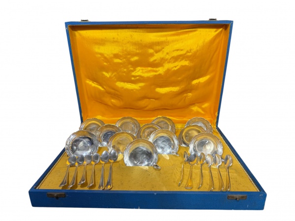 • METAL PRATEADO, doze (12) taças para sobremesa com suas respectivas colheres confeccionadas em metal espessurado a prata com bordas repuxadas e alças em elementos vegetalistas, acondicionada em estojo com forração interna na tonalidade amarela e externa na tonalidade preta, taças medem 7x10,5x10cm, e estojo 10x51x36cm, leves falhas externas.