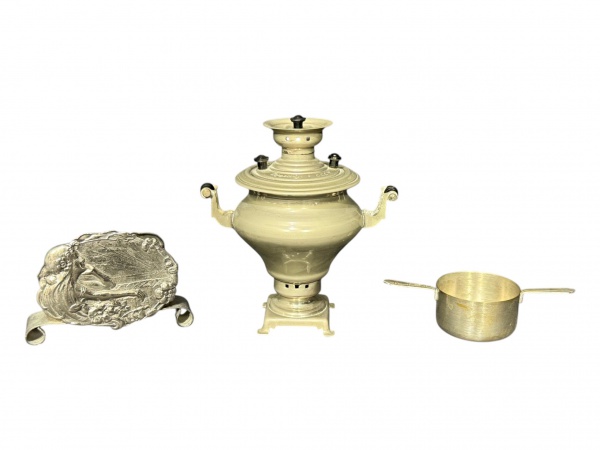 • METAL PRATEADO, lote com três (3) peças de modelos, tamanhos e decorações distintas, sendo: A) 1 mini samovar em metal niquelado com inscrições em russo, medindo 13x12cm, B) 1 porta guardanapos ao gosto art noveau em estanho, medindo 6,5x10cm e C) 1 dosador de whisky em metal espessurado a prata, medindo 3x11,5x5cm.