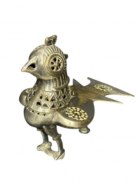 • METAL PRATEADO, um (1) incensário confeccionado em metal espessurado a prata representando pássaro com cinzelado geométrico em vazados, apresenta falhas na prateação, possivelmente de origiem indiana, medindo 14,5x15x9cm.