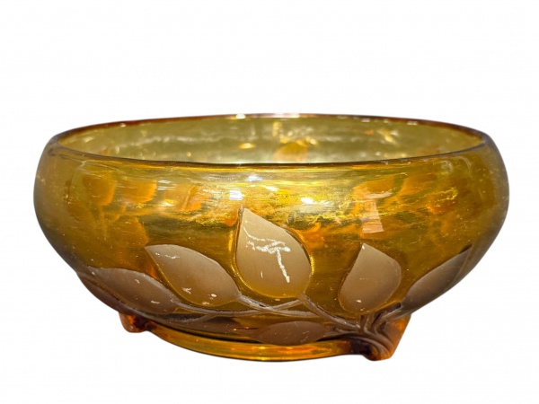 • DEMI CRISTAL, uma (1) fruteira confeccionada em demi cristal na tonalidade âmbar com lapidação de folhagens em relevo na tonalidade fumê, medindo 10x21cm.