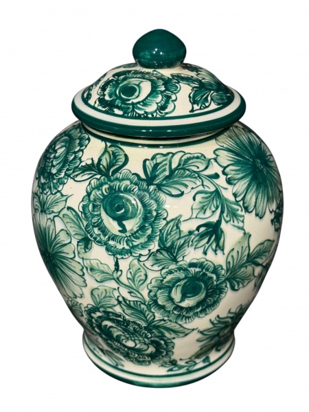 • LUIZ SALVADOR, um (1) potiche confeccionado em faiança vitrificada na tonalidade branca com pintura floral em monocromia na tonalidade verde, apresenta imperceptível bicado na tampa, medindo 20x8,5cm.