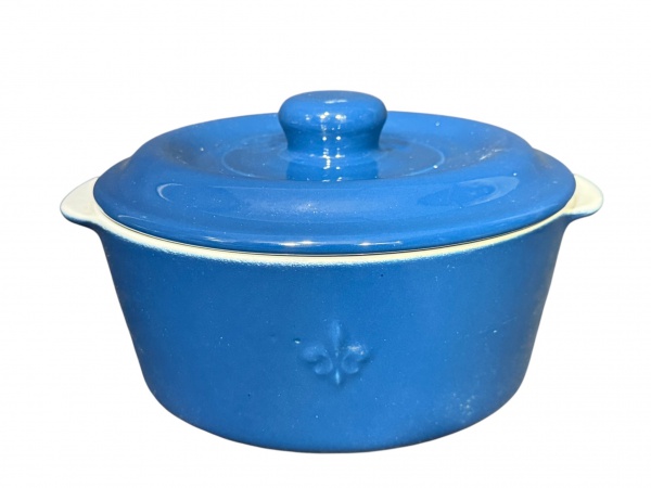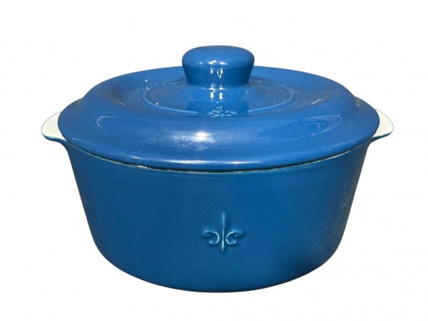 • FONTIGNAC (é uma marca francesa ligada ao grupo Arc International, mesma empresa da Luminarc, Arcoroc etc.), uma (1) caçarola confeccionada em porcelana refratária esmaltada na tonalidade azul, decorado por florão relevado, medindo 24x24x22cm.