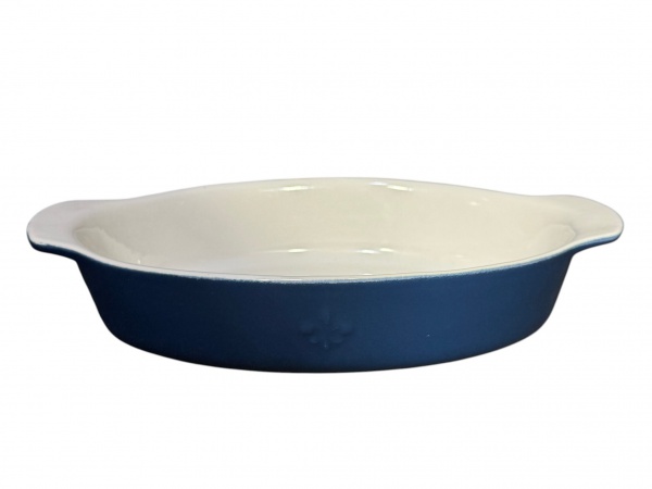 • FONTIGNAC (é uma marca francesa ligada ao grupo Arc International, mesma empresa da Luminarc, Arcoroc etc.), uma (1) pirex oval confeccionado em porcelana refratária esmaltada na tonalidade azul, decorado por florão relevado, medindo 6x30x17,5cm.