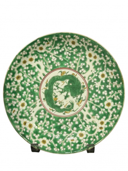 • PORCELANA ORIENTAL, um (1) prato decorativo confeccionado em porcelana oriental, de formato circular, com decoração esmaltada em tons de verde, branco, amarelo e detalhes em vermelho, apresentando ao centro dragão estilizado, ladeado por motivos florais e vegetalistas em toda a aba; verso com marca apócrifa em azul sob o vidrado e elementos florais ao redor, medindo 22cm.