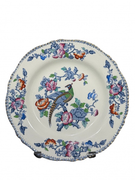 • WOOD & SONS, Mayfair, Inglaterra, um (1) prato decorativo confeccionado em faiança inglesa na tonalidade branca, decorada por faisões e elementos florais em policromia e borda dentada filetada em ouro, medindo 23cm.