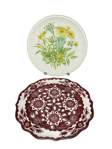 • FAIANÇAS, lote com dois (2) pratos decorativos confeccionados em faiança, sendo: A) 1 STAFFORDSHIRE, decorado por elementos florais em policromia borda com recorte relevado e filetada na tonalidade verde, medindo 25,5cm e B) 1 sem manufatura aparente, decorado por elementos florais em monocromia na tonalidade marrom, medindo 25cm.