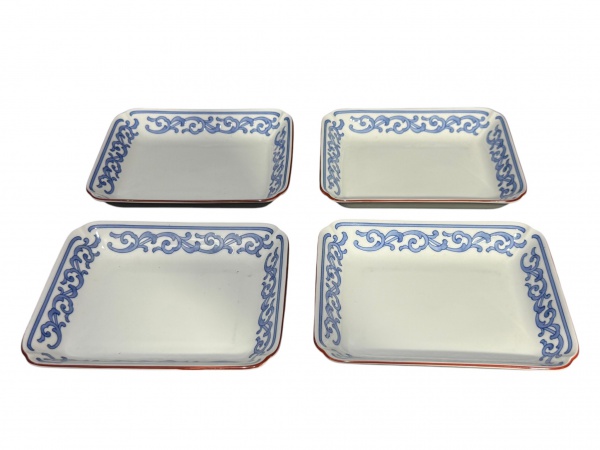 • NORITAKE e VARIG, quatro (4) petisqueiras retangulares confeccionadas em porcelana na tonalidade branca com arabescos na tonalidade azul e borda filetada na tonalidade rouge, medindo 16x13,5cm.