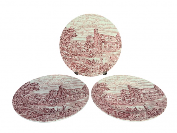 • FAIANÇA BURSLEY (Inglaterra), três (3) pratos decorativos confeccionados em faiança inglesa na tonalidade branca, modelo THE POST HOUSE, decorado por cena de carruagem na tonalidade rosa, medindo 20,5cm. 1 com sinais de craquele.