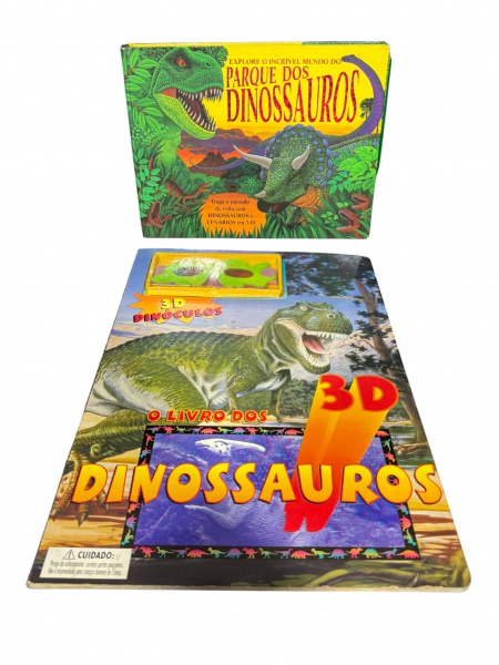 • COLECIONISMO, um (1) conjunto O Livro dos Dinossauros  3D, com proposta educativa e interativa, apresentando ilustrações em efeito tridimensional, acompanhado de óculos 3D (Dinóculos), conforme indicado na capa.Acompanha caixa original ilustrada intitulada Explore o Incrível Mundo do Parque dos Dinossauros, com cenas e representações de dinossauros em ambiente pré-histórico.Peça destinada ao público infantil, com caráter didático e visual, típica de publicações interativas do final do século XX / início do século XXI.Caixa e livro apresentam desgastes, marcas do tempo e sinais de manuseio, compatíveis com a antiguidade do item. Estado de conservação conforme fotos.