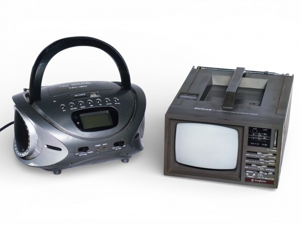 • SOM e ELETRÔNICO, lote composto por dois (2) itens, sendo: A) um (1) rádio portátil TRC SOUND, modelo TRC-160 moderno, com alça superior, reprodução de CD, entradas USB / cartão de memória, visor digital e controles frontais, medindo 11,5x24x22cm e B) um (1) televisor portátil antigo da marca DELUXE, preto e branco, modelo compacto, com alça superior, seletores frontais, controles de sintonia, volume, brilho e contraste, característico da produção das décadas finais do século XX, medindo 13x20x26cm;