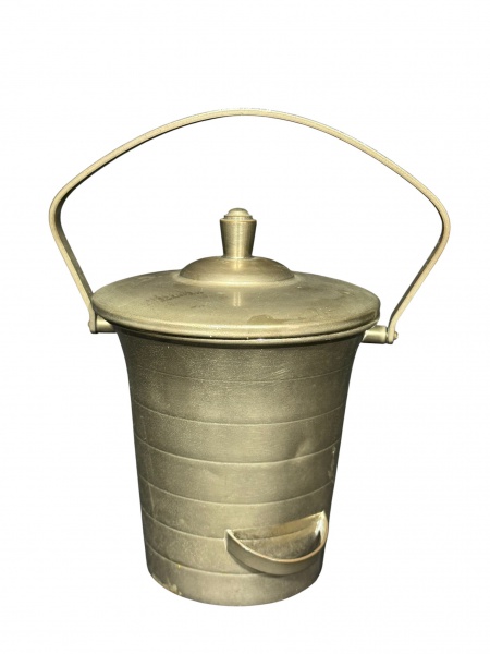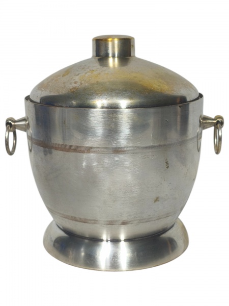 • <b>METAL PRATEADO</b>, um (1) balde de gelo confeccionado em metal espessurado a prata, alças em argola, bojo em frisos torcidos, isopor na parte interna com marcas do tempo, apresentando falhas na prateação, medindo 23x22x19cm.