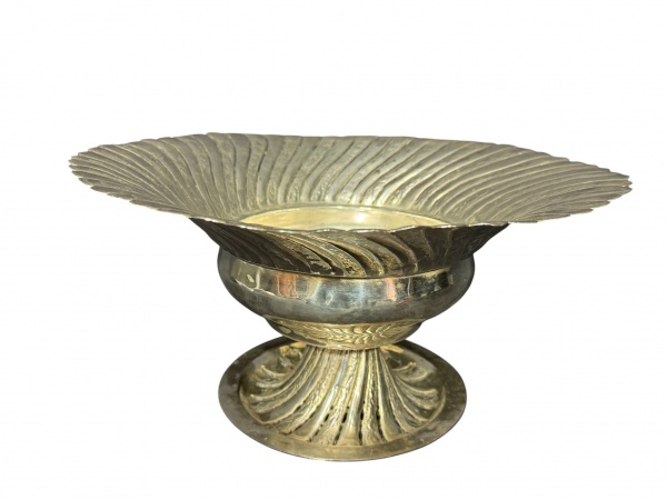 • METAL PRATEADO, uma (1) fruteira confeccionada em metal espessurado a prata com borda e base cinzelada em gomos torcidos e elementos vegetalistas, banho novo, apresenta leves mossas, medindo 20x36,5cm.