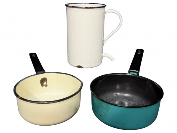 • ÁGATAS, lote com três (3) peças confeccionadas em ágata esmaltada, sendo: A) 1 jarra de enema na tonalidade creme, borda na tonalidade azul, apresentando batida e sinais de oxidação na borda, medindo 16,5x15x11cm e B) 2 papeiros, 1 na tonalidade creme e 1 na tonalidade verde, com alça em material plástico, medindo 6,5x27x14cm (pequenas batidas) e  6x28x15cm.