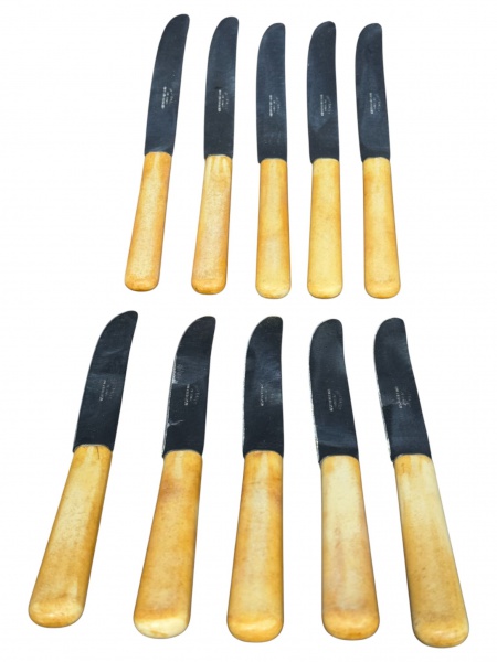 • METAL PRATEADO INOX, dez (10) facas para jantar confeccionadas em aço inox de industria argentina com cabo em baquelite imitando marfim.