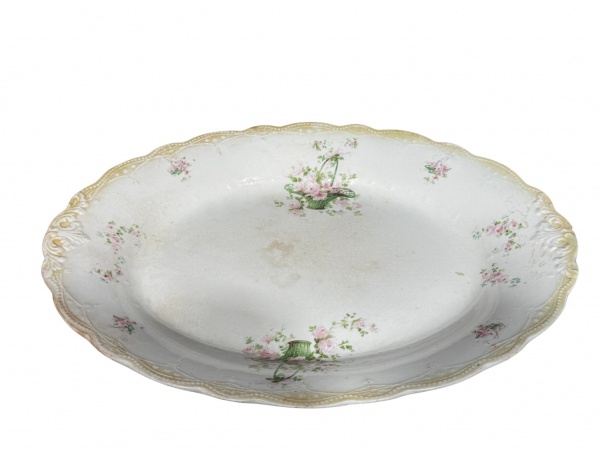 • Myott, Son & Co. Ltd. (A empresa foi fundada em 1898, em Cobridge, Staffordshire), uma (1) travessa oval confeccionada em faiança inglesa na tonalidade branca, decorada por perolados e elementos vegetalistas em relevo na pasta, pintura de cestos de flores em policromia, apresenta bicados na borda, leves marcas do tempo e craquele, medindo 45x35cm.