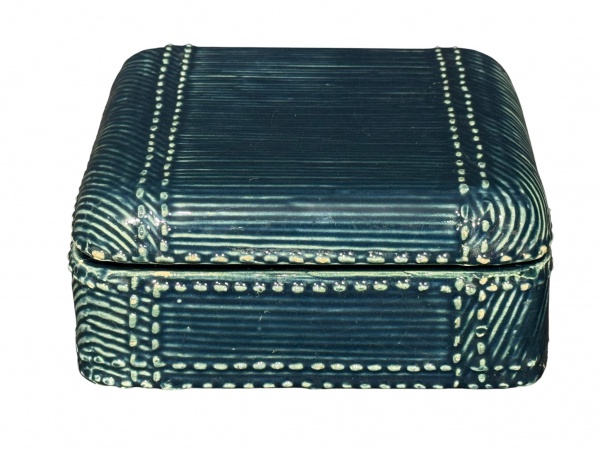 • FAIANÇA, uma (1) caixa porta joias quadrangular confeccionada em faiança vitrificada na tonalidade azul jeans, moldada por frisos torcidos e perolados em relevo, medindo 8x17x17cm, sinais de craquele e marcado ART GILA.