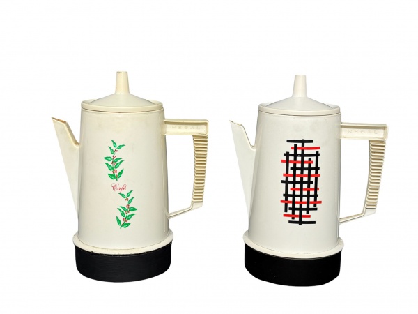 • DIVERSOS, duas (2) cafeteiras vintage confeccionados em plástico rígido da marca REGAL na tonalidade branca, sendo 1 com decoração abstrata nas tonalidades preta e vermelha, medindo 28cm e 1 decorado por flores e folhagens em policromia e inscrição café, medindo 28cm.