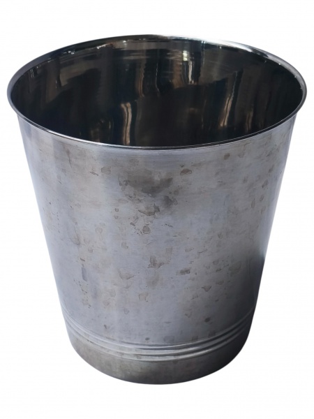• <b>METAL INOX</b>, uma (1) champanheira confeccionada em aço inox, decorada por frisos horizontais em baixo relevo, medindo 20,5x20cm.
