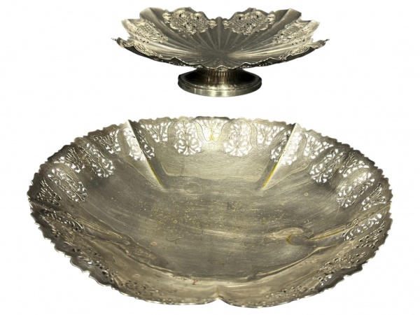• METAL PRATEADO, duas (2) fruteiras confeccionadas em metal espessurado a prata, sendo: A) 1 de pé da manufatura REGIA, cinzelado vegetalista em vazados e bordas em recortes, medindo 6x24cm e B) 1 da manufatura WOLFF, cinzelado vegetalista em vazados, falhas na prateação, mossa no fundo e pés em bola, medindo 6,5x26cm.