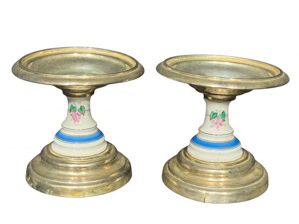 • METAL PRATEADO e PORCELANA, par (2) de castiçais confeccionados em metal espessurado a prata, base escalonada, corpo em porcelana com espessa faixa na tonalidade azul e elementos florais em policromia, apresenta sinais de oxidação e fissura no metal, vide foto, medindo 13x13,5cm. Apresenta mossa na bobeche.