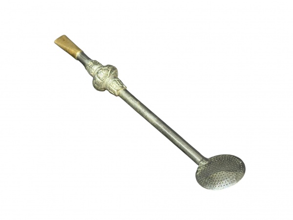• METAL PRATEADO, uma (1) bomba para chimarrão confeccionada em metal prateado, corpo cilíndrico com florão em relevo, boquilha em metal dourado, apresenta craquele no florão, medindo 25cm de comprimento.
