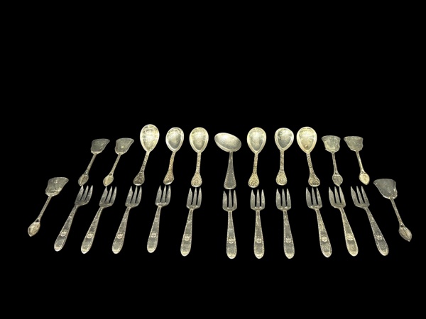 • METAL PRATEADO, vinte e quatro (24) peças confeccionados em metal espessurado a prata de modelos distintos, sendo: A) 11 garfos para bolo com cinzelado vegetalista, B) 12 colheres para sobremesa de 2 modelos e C) 1 colher para papinha com cinzelado vegetalista.